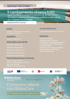 Ultimi giorni per iscriversi al corso «Il cambiamento chiama tutti - Spazi e modi di co-programmazione e co-progettazione di funzioni e attività della biblioteca pubblica e dell'achivio con i cittadini e la comunità», realizzato nell'ambito del progetto della Provincia di Lucca, Bibliocare e che rientra nel bando Giovani e Adulti In-formati, sono stati progettati dalla rete BiblioLucca e hanno l'obiettivo di fornire strumenti concreti e nuove competenze, utili agli operatori soprattutto per includere i cittadini più fragili o meno presenti tra gli utenti tipici.