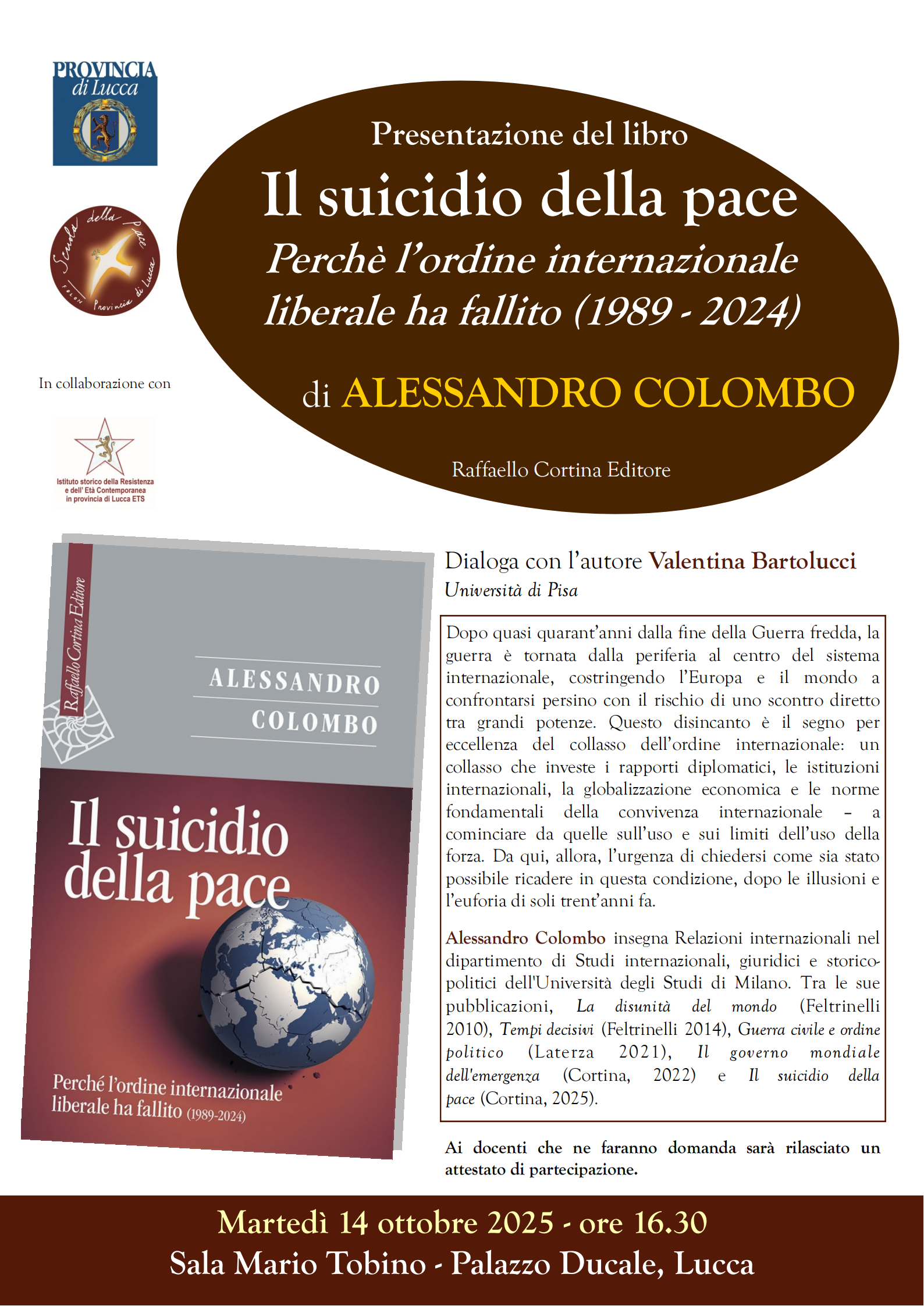 Sarà Alessandro Colombo, autore del libro «Il suicidio della Pace - Perché l'ordine internazionale ha fallito (1989-2024)» a presentare il suo stesso lavoro, dialogandone con Valentina Bartolucci, dell'Università di Pisa. L'incontro, che rientra nel programma della Scuola per la Pace della Provincia di Lucca, è in programma martedì 14 a partire dalle 16:30 in Sala Tobino a Palazzo Ducale.