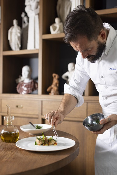 Era la sala d’armi dell’antica Rocca di Sala, la fortezza quattrocentesca, e per entrarvi si accede dal lounge bar oppure da uno stretto corridoio che si apre a cerchio in quello che fu il torrione delle mura cittadine che lambisce il giardino-aranceto in cui si può cenare al fresco dell’estate tra le opere di Bernard Bezzina. Prima del torrione, sulla sinistra, si apre un ambiente emozionante. Un museo: una gipsoteca ricca di calchi di opere famose, a cominciare dalla celebre statua dell’imperatore Ottaviano Augusto. Il bianco dei gessi si esalta nel contrasto con le pareti in pietra e i preziosi arredi in legno realizzati tutti a mano da un artigiano locale. Anche qui i tavoli sono in ferro con il piano in marmo bardiglio che, con agili sedie, si alternano a sedute-divano in velluto grigio Casamance. Una preziosa nicchia accoglie un bel tavolo tondo. La caratteristica volta a botte si esalta con il contrasto dei motivi neoclassici. I moderni sgabelli del bancone bar e le contro-travi in ferro che porgono l’illuminazione ai tavoli insieme alla mise en place di sobria eleganza (porcellane perlopiù bianche o in tinte tenui) rendono l’ambiente davvero accogliente che coccola già al primo impatto e annuncia quella che sarà una notevole esperienza gastronomica. I piatti dello chef Alessio Bachini, che porta la sua esperienza di lunghi anni in una cucina stellata, sanno al tempo stesso di freschezza e di tecnica, e alla massima freschezza attengono le materie prime, che provengono dal mare e dal Paradis Agricole con i suoi campi, i suoi orti, i suoi allevamenti. “Ogni giorno – si legge nella presentazione del menu – la nostra agroforesteria raccoglie e seleziona per noi verdure fresche e di stagione. Un percorso che prende vita dal Paradis Agricole e le porta direttamente dal seme al piatto, lasciandone inalterato il gusto naturale”. Insomma, un viaggio “pensato e ideato dallo chef per riscoprire i sapori autentici della natura”: poche righe per annunciare la filosofia di una carta intrigante, ma non ridondante di proposte, solo cinque per ogni referenza, come cinque sono le portate del menu degustazione, proposto a 70 euro più coperto e acqua, e del menu degustazione vegetariano allo stesso prezzo. Una carta che lo chef ha costruito, come rivela lui stesso, anche ripensando a ricordi antichi, alle tradizioni di casa, ai piatti tipici della cucina toscana preparati dalla nonna con le erbe che andavano a raccogliere insieme. Ecco gli amuse-bouche vegetariani, tutti dall’orto del Paradis Agricole, presentati in ciotole e piatti di legno o di marmo su un bel vassoio pure di legno: il raviolo fritto ripieno di verza e zenzero, la cecìna con burro aromatizzato, il cavolino di Bruxelles ripieno di maionese di capperi, il cestino di fieno con rosa di barbabietola, il cannolo di mais con crema di cavolfiore. Poi, via a un autentico carosello di sapori tra memorie di tradizione e raffinate creazioni: c’è la ricciola marinata con un gazpacho di frutta e verdure, carciofo e chips di topinambur; il pomodoro; le animelle di vitella sempre abbinate con frutta o verdura in consistenze e acidità diverse. Nel periodo invernale le lumache biologiche; la triglia con pinoli e finocchi; i tortelli di pollo con salsa cibreo; le pappardelle con coniglio dell’Azienda, mirtilli e erbe amare; i rigatoni con ricci di mare, calamaretti e rucola; mezzi paccheri con seppia e bieta; il coniglio alla cacciatora; l’uovo croccante che cambia sempre in base alle verdure di casa; il rombo con funghi porcini e patate. “Giusto in questo periodo – dice Alessio Bachini – stiamo lavorando sulla frollatura del pesce, dove ne è un chiaro esempio la triglia. Dopotutto perché frollare solo le carni? Molti pensano che il pesce più buono sia quello appena pescato. Invece, frollandolo il pesce acquisisce sapore, morso e consistenze diverse da quelle a cui siamo abituati. Chiaramente, ogni tipo di pesce ha la propria tempistica proprio come la carne”. Nei dessert da ricordare: tentazione al cioccolato; brioche con marmellata di albicocche, zenzero e rosmarino; robiola e fichi; millefoglie alla vaniglia, latte di capra e arancio; castagne e pere. La filosofia del ristorante è: scarto zero, il cosiddetto zero waste. La brigata tutta lavora la materia prima dalla a alla z. Dalla cipolla, dove viene usata ogni sua parte, quella tenera all’interno fino alle foglie esterne e la buccia, alla seppia dove con la polpa viene mantecata la pasta, con i tentacoli e l’osso interno viene fatto il jus mentre con le interiora viene creata una salsa adagiata poi sopra. Eventuali scarti obbligati vengono usati come mangime per gli animali presenti a Paradis Agricole. In tutte le proposte del menù, la verdura o la frutta oltre che essere a km 0 e, ovviamente stagionali, hanno un ruolo fondamentale; non sono soltanto un accompagnamento ma servono ad equilibrare il piatto stesso con acidità, freschezza e aromaticità diverse.
