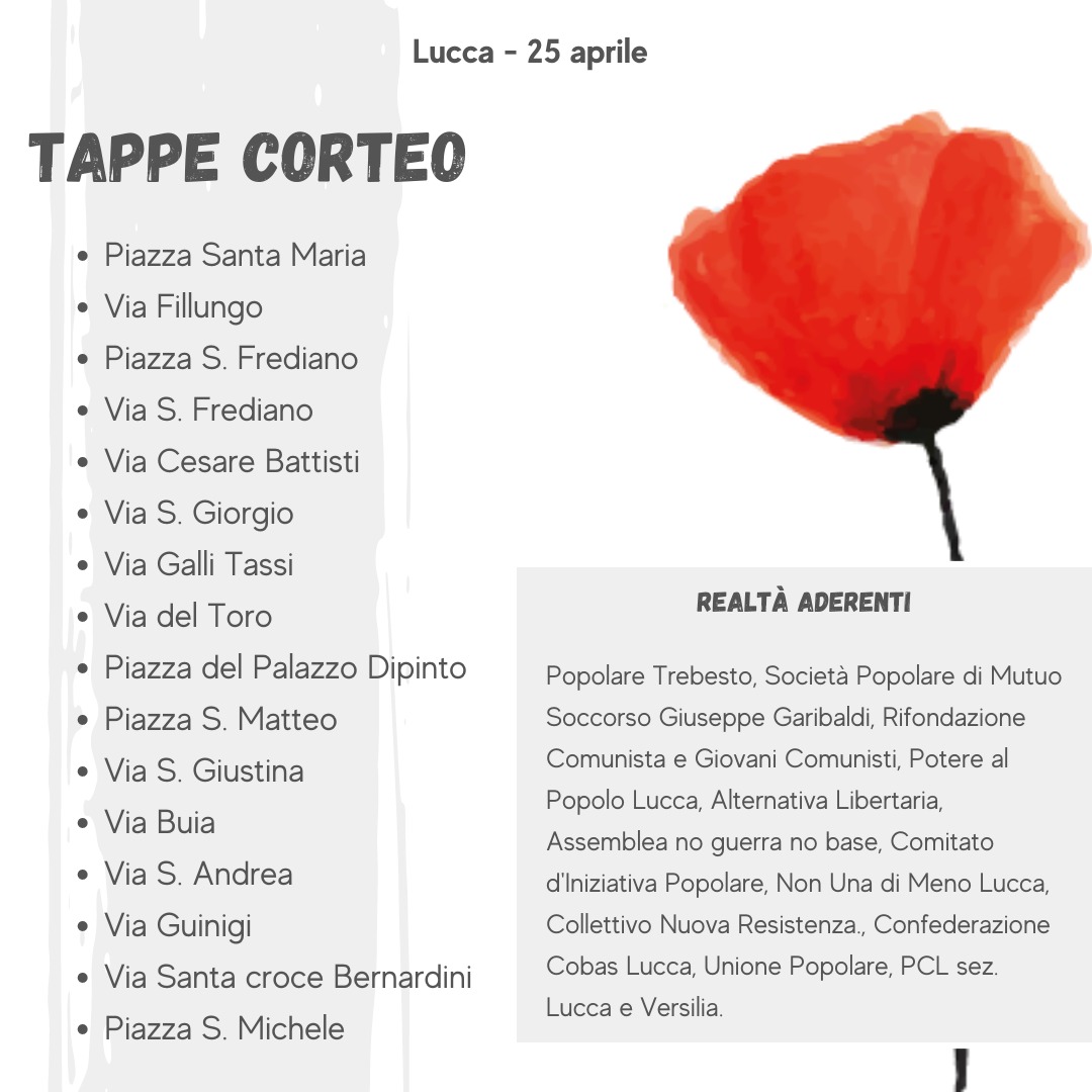 Promosso da diverse realtà del territorio - Collettivo Nuova Resistenza, Società Popolare di Mutuo Soccorso, Popolare Trebesto, Non una di Meno Lucca, Assemblea No Guerra No base, Comitato d’Iniziativa Popolare, Alternativa Libertaria, Confederazione Cobas Lucca, Potere al Popolo Lucca, Rifondazione Comunista e Giovani Comunisti, Unione Popolare Lucca e Pcl sez. Lucca e Versilia – il corteo si svilupperà lungo i luoghi simbolo della resistenza.