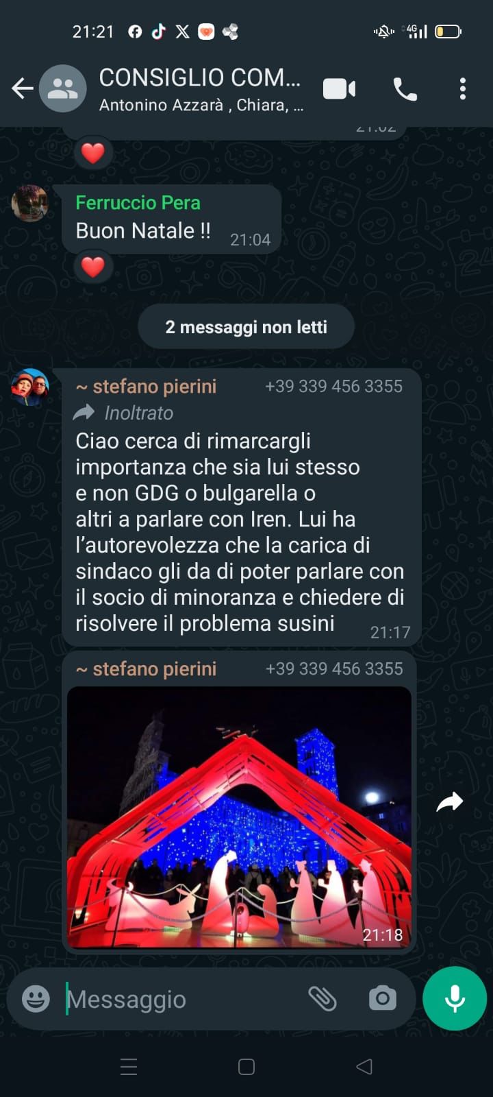 La sera del 24 di dicembre alle ore 21.18 il consigliere Stefano Pierini di Lucca 2032 invia nella chat dell’interoconsiglio comunale, fino a quel momento animata solo dai consueti auguri di Natale, il seguente messaggio: