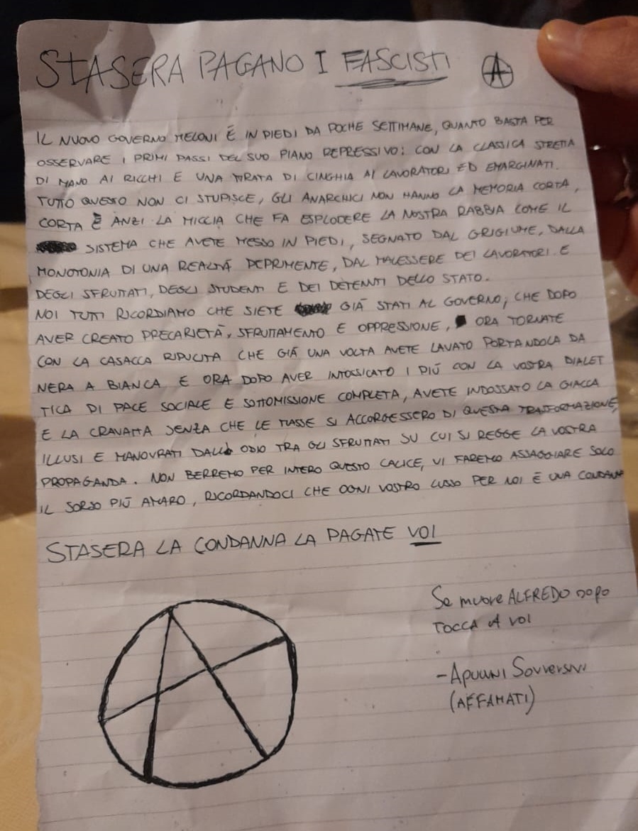 "Il deputato Alessandro Amorese, eletto anche sul territorio di Lucca - continua la nota - qualche giorno fa è stato aggredito a Massa da appartenenti all'estrema sinistra. Il fatto è avvenuto in una pizzeria, a cui è stato lasciato anche un volantino di rivendicazione dell'aggressione. Oltre alla minaccia fisica, sono state fatte minacce di morte sia verso Amorese che altri appartenenti a Fratelli d'Italia".