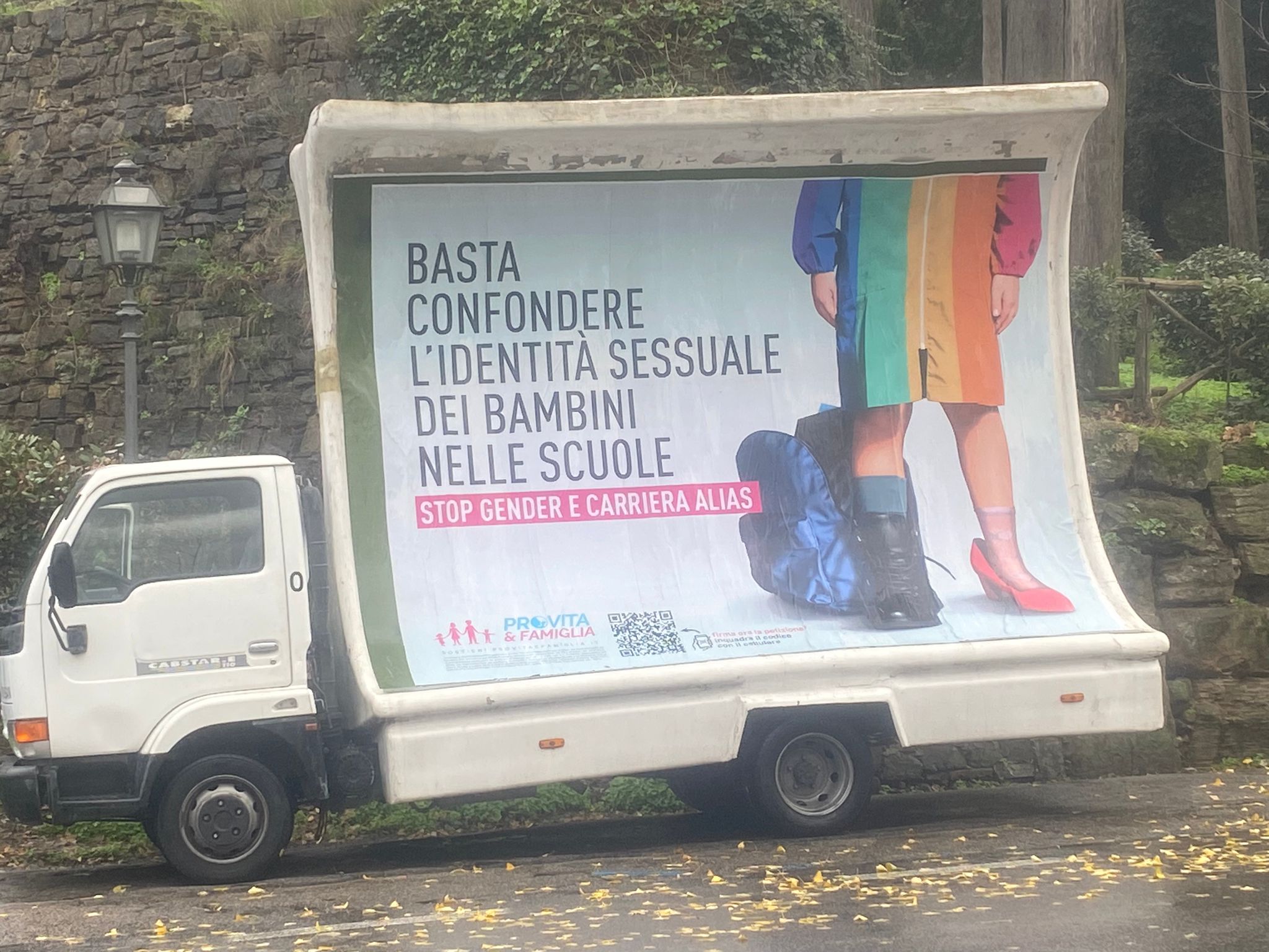 «Non ci fermiamo né ci facciamo intimidire dalla censura politica del comune di Firenze. Lo avevamo detto e lo abbiamo fatto: dopo la vergognosa copertura delle nostre affissioni, su ordine dell'assessore esponente del PD Benedetta Albanese - di cui ancora chiediamo le dimissioni perché non può con queste decisioni rappresentare i cittadini e le famiglie fiorentine -, da oggi in giro per la città ci sono i nostri camion vela, con lo stesso messaggio: "Basta confondere l'identità sessuale dei bambini nelle scuole. Stop gender e carriera alias" e l'immagine delle gambe di un bambino con una calzatura da uomo e una calzatura da donna. Non possiamo e non vogliamo farci fermare perché la posta in gioco è troppo alta: è in pericolo non solo la libertà di espressione, ma soprattutto la tutela di bambini e ragazzi, oggi martellati dall'indottrinamento gender nelle scuole e dalla pericolosa carriera alias, che rischiano di far credere agli studenti che si possa "nascere nel corpo sbagliato", spingendoli a cambiare nome o addirittura al "cambio di sesso", anche con bombardamenti ormonali e interventi chirurgici. Chi si prenderà la responsabilità di rischiare di cagionare a minori danni psicofisici traumatici e in alcuni casi irreversibili? Inoltre sappiamo bene che la maggioranza dei cittadini è contraria a questi progetti, infatti come rivelato da Noto Sondaggi per conto di Pro Vita & Famiglia, ben l'80% degli italiani si dichiara contro l'indottrinamento gender nelle scuole». Così Jacopo Coghe, portavoce di Pro Vita & Famiglia onlus