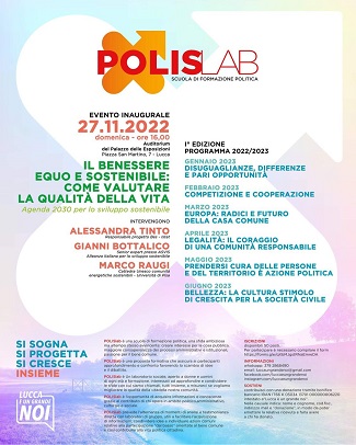 PolisLab è una scuola di formazione politica aperta a donne e uomini di ogni età e formazione, interessati ad approfondire e condividere le sfide con cui città e cittadini sono chiamati a misurarsi con l'obiettivo di migliorare la qualità della vita della comunità. Il primo ciclo di lezioni si terrà a Lucca da gennaio a giugno 2023 e prevede l'alternanza di momenti di analisi e testimonianza diretta da parte di esperti con laboratori di gruppo, utili a facilitare l'acquisizione di informazioni, condividere idee e individuare azioni comuni relative alla partecipazione "dal basso" orientate al bene comune e così contribuire alla vita politica cittadina.