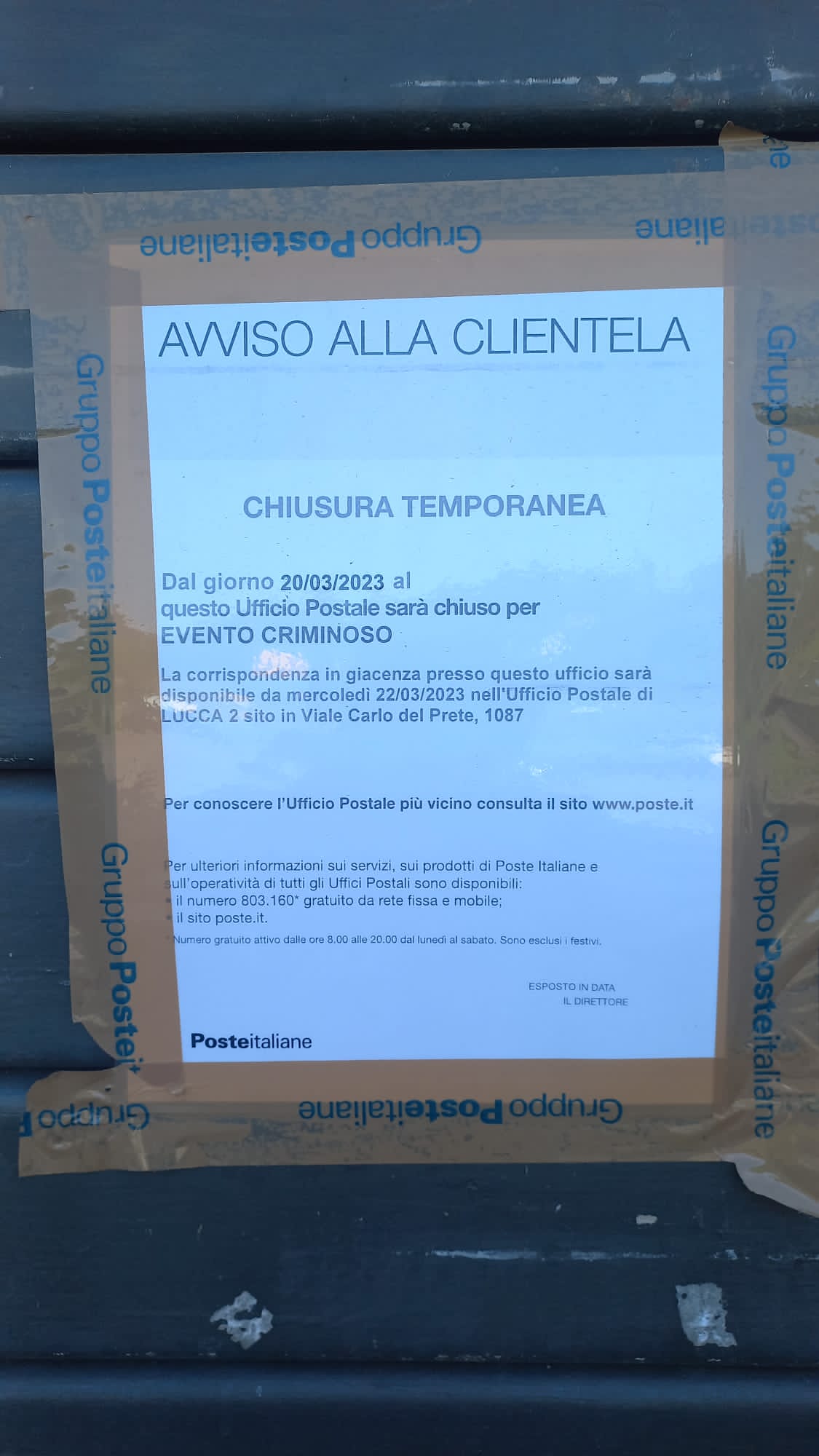 “Quando riapre lo sportello postale di Mutigliano, limitrofo al bar Bao all’incrocio per Cappella Alta, chiuso dal 20 marzo scorso (e per ora a tempo indeterminato) dopo un evento criminoso? La chiusura infatti sta creando gravi disagi agli utenti, in particolare anziani, della zona, che adesso hanno l’ufficio più vicino addirittura in via Carlo Del Prete, nella circonvallazione del Centro storico”.